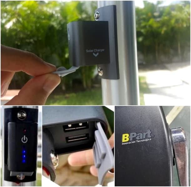 Una de las aplicaciones más inmediatas de las láminas solares es la recarga de dispositivos móviles. Y el mejor sitio para colocarlas es cualquier superficie que esté bien soleada. La marca B-Part creó una sombrilla solar que es un ejemplo perfecto de este tipo de integración.