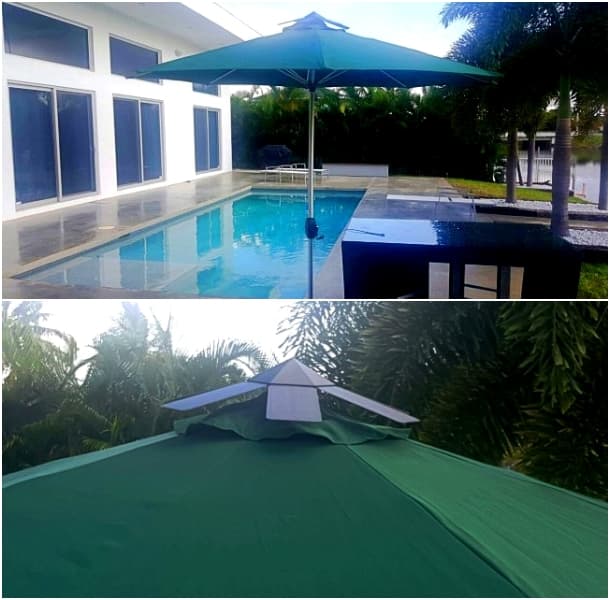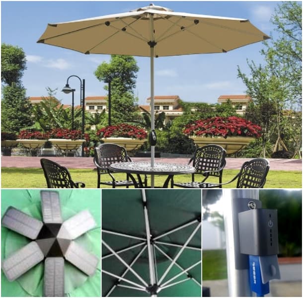 La sombrilla se compone de 8 ‘costillas’ de aluminio cepillado anodizado, por lo que es bastante ligera. Tiene un diámetro de 2,7 metros y es fácil de abrir y cerrar (tiene manivela). Las láminas solares están colocadas en la parte superior, mientras que la batería y puertos de carga están adosados al mástil.
