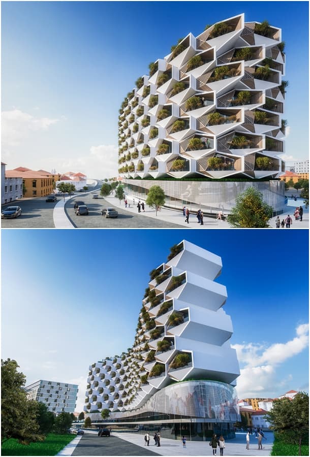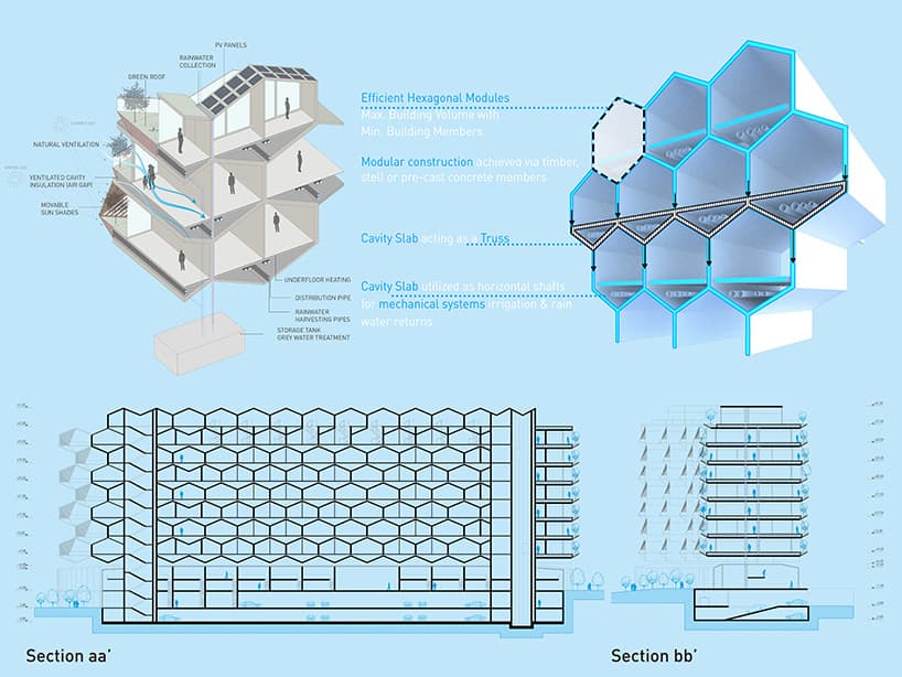 Su fachada tiene la forma de una colmena, y expresa perfectamente parte de su carácter. Es por tanto un diseño que surge del apilamiento de sus módulos de sección hexagonal.