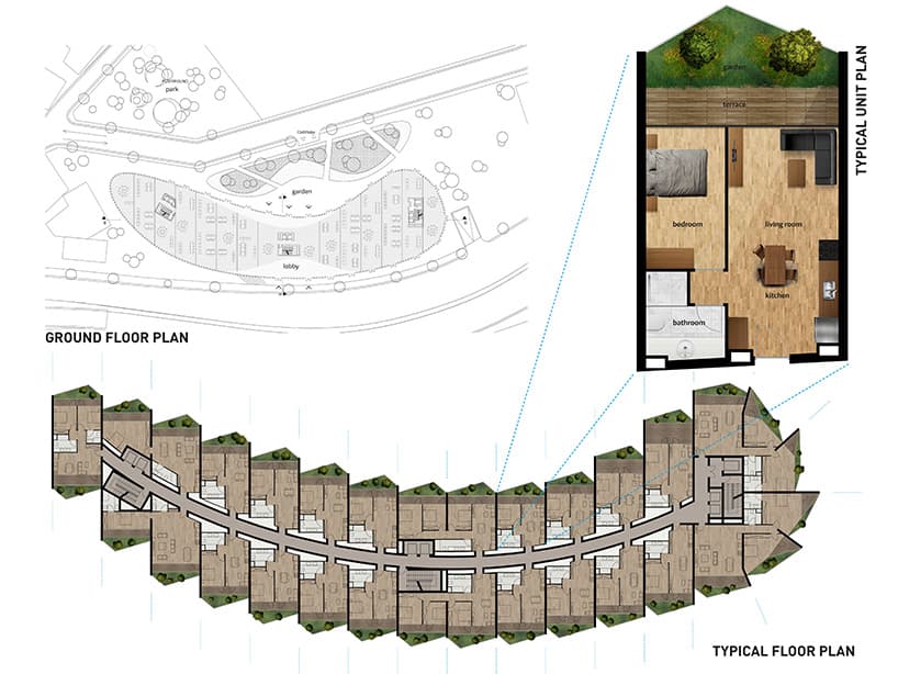 En líneas generales, cada módulo de este bloque de apartamentos tiene un dormitorio. Con ellos se componen estudios, y apartamentos de uno o más dormitorios. Debido a su reducido tamaño, los apartamentos poseen un espacio abierto que incluye cocina, comedor, y sala. Todos tienen al menos una terraza-jardín con sistema de riego incorporado.