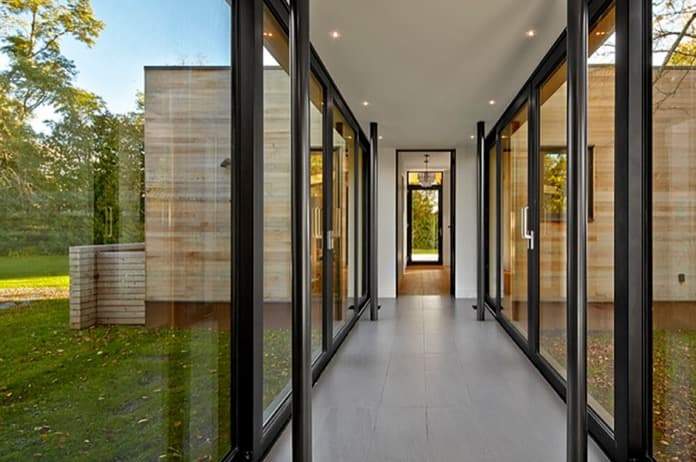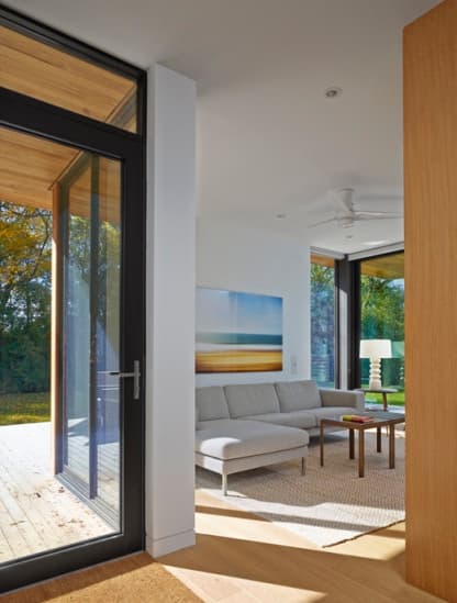 Se colocó cerca de la cabaña existente, comprada en la década de 1970. A pesar del contraste entre ambas, pues la nueva tiene un estilo más contemporáneo, hay un denominador común: la madera. Se utilizó madera de roble, cedro, y pino, procedente de bosques próximos. Fue combinada, tanto en el interior como exterior, con otros materiales que requieren de poco mantenimiento.