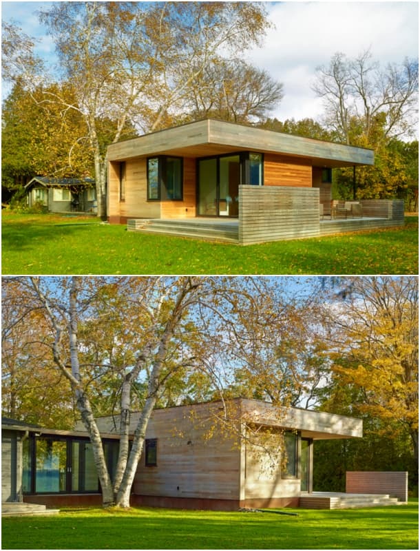 Pointe es una moderna cabaña de madera que se construyó en taller y luego se ensambló en el sitio. Por su diseño y acabados, es una construcción que parece hecha de manera convencional, cuando en realidad se trata de una cabaña prefabricada.