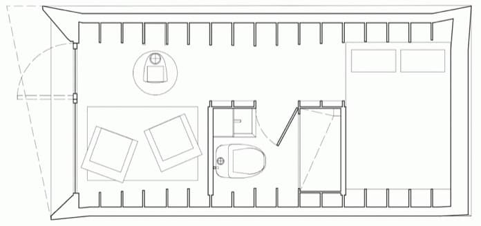 Este espacio prefabricado pretende ser la solución perfecta para una escapada a la naturaleza, a la tranquilidad del campo. Dentro encontraremos una cama, encajada al fondo de su espacio. En la entrada hay una pequeña sala, con una estufa de leña, donde caben dos cómodas sillas y una lámpara. En la parte central se ha podido introducir un aseo. Está equipado con inodoro de compostaje, ducha, y un lavabo.