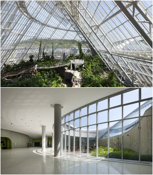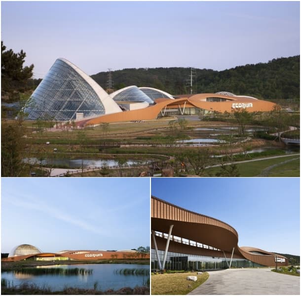 Estas atractivas imágenes corresponden a un proyecto con imponentes invernaderos. Es el complejo Ecorium del Instituto Nacional de Ecología, de Corea del Sur. Es una reserva natural de unos 33.000m² construida para servir como centro de estudio y educación medio ambiental. Promueve la importancia y cuidado del medio ambiente a sus visitantes, mediante exposiciones y programas educativos.