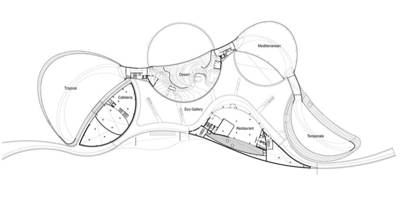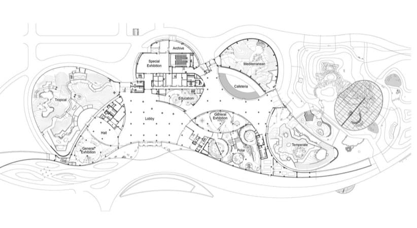 Un vestíbulo de bienvenida ofrece vistas a las diferentes áreas climáticas. Hay exposiciones permanentes, además de teatro, cafeterías, y tiendas de souvenirs.