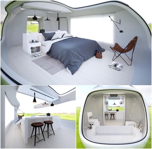 Este pod no llega a tener una forma tan ahuevada como EcoCapsule, pero sí es de superficies bastantes redondeadas. Y también es más grande, mire por donde se mire. Tiene cama de matrimonio, con un mueble-cocina en su cabecero. Esto significa que si se derrama una cacerola con caldo, esa noche tocará dormir en el suelo. Llama la atención que su interior se complete con muebles tan cotidianos, cuando lo lógico hubiera sido recurrir a un mobiliario diseñado para la ocasión. Aquí EcoCapsule vuelve a salir victoriosa, porque con menos espacio, hace un mejor aprovechamiento, cuidando el confort.