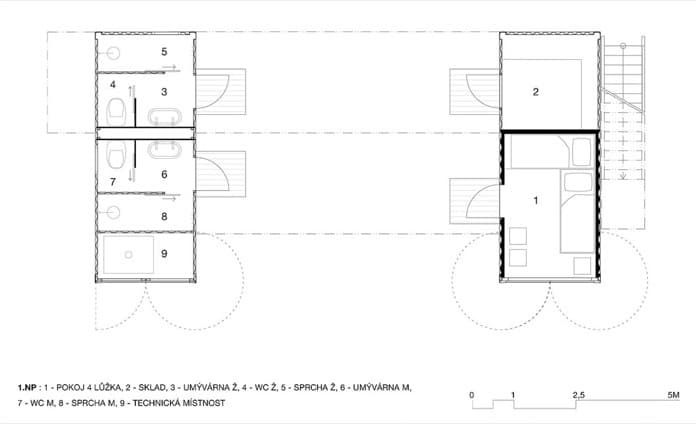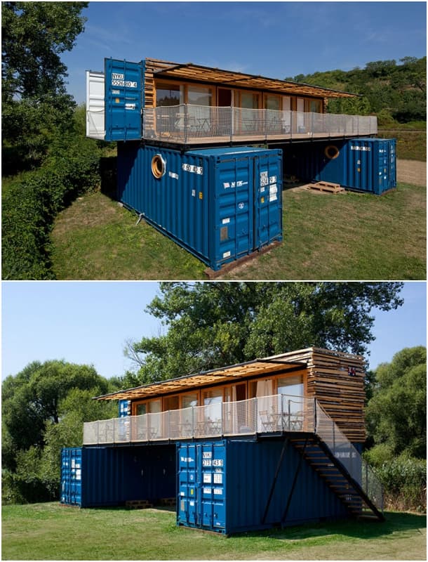 El proyecto se ubica junto al río Elba, muy cerca de la preciosa ciudad de Litomerice (República Checa). El edificio está compuesto por un contenedor de 40 pies, apoyado en sus extremos en dos contenedores de 20 pies. La capacidad máxima de este hotel container es de 12 personas.