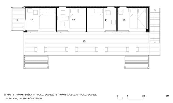 En los contenedores de planta baja se han dispuesto dos cuartos de baño con duchas, un almacén, y una habitación de camas-litera. En la planta superior hay una fila de 4 habitaciones, todas ellas conectadas a una terraza. Es obvio que esta disposición no es la más adecuada para garantizar la tranquilidad de los huéspedes. Primero porque el piso es de madera, y segundo porque no se tiene constancia de que las puertas correderas de las habitaciones tengan un aislamiento especial al ruido.