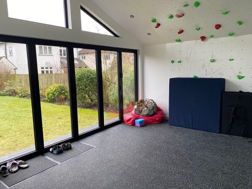 - Suelo de goma, en rollo. Esta solución es ideal para gimnasios.