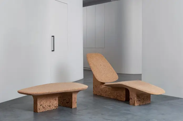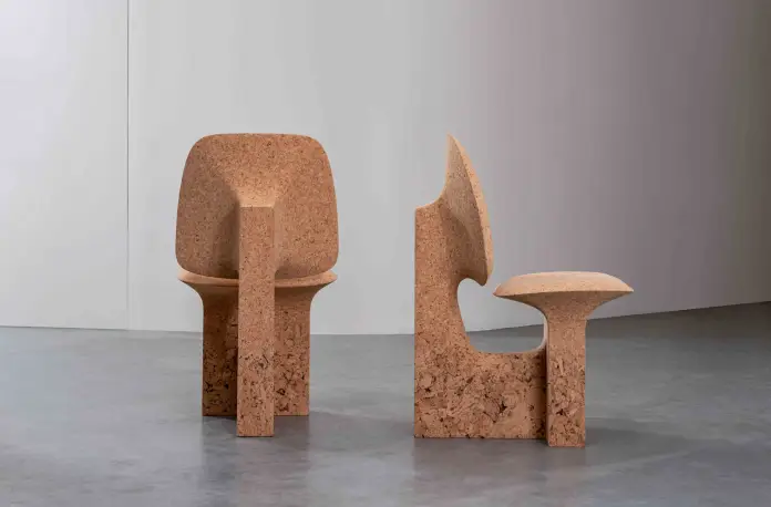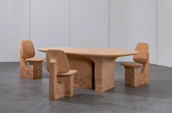 La singularidad de estas piezas es que cada mueble ha sido tallado en una sola pieza. Son de un aspecto elegante y armonioso, abarcando desde una mesa hasta una otomana o una silla. El diseñador desarrolló su propio proceso para incorporar la textura rugosa del corcho quemado, un desecho industrial que ha encontrado una nueva vida en esta línea de muebles.