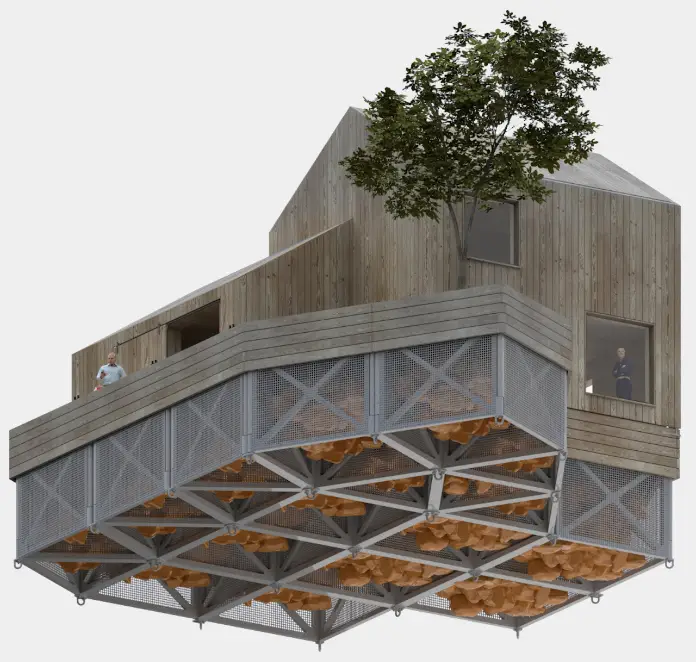 Los fundamentos de este sistema de construcción modular tienen raíces antiguas. Invierten el diseño típico de la jaula de gaviones, normalmente llenas de escombros, para crear cimientos de bajo costo. En su lugar, se llenan con soportes de flotación reciclados y de origen local para sostener cualquier estructura que se construya encima. Las jaulas de paquete plano están hechas de plástico reciclado reforzado, facilitando el transporte y montaje en el lugar.