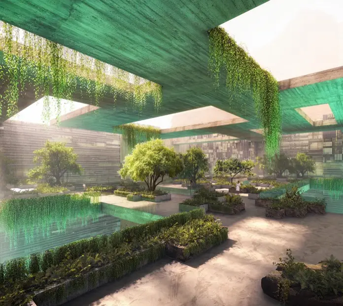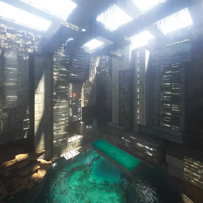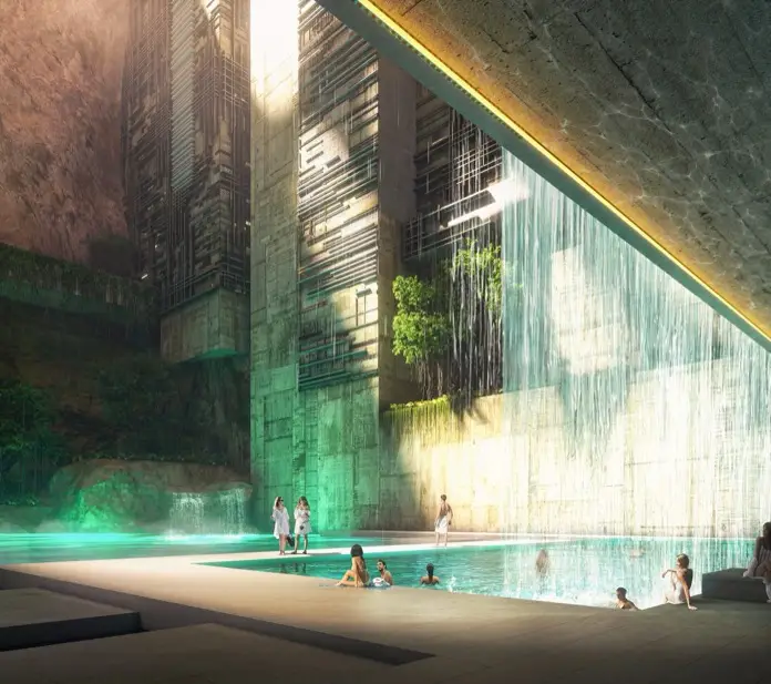 Las imágenes revelan un gran edificio de hormigón con balcones geométricos que sobresalen de las paredes. Profundos recortes albergan terrazas y patios, estanques, y cascadas interiores, creando un ambiente de lujo y naturaleza integrada. Nathalie Rozencwajg, fundadora de Name Architecture, describe el diseño como un «cubo mágico» alrededor del cual todo se desarrolla.