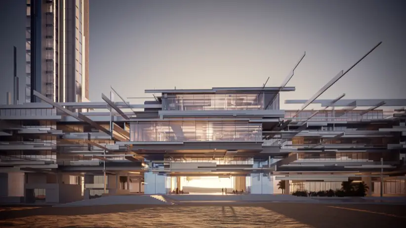 El diseño de Epicon es obra del estudio de arquitectura 10Design, conocido por algunos de sus originales y atrevidas arquitecturas. Epicon contará con dos imponentes rascacielos, uno de 225 metros y otro de 275 metros de altura, que se alzarán en medio del paisaje desértico. Estas estructuras, revestidas con materiales reflectantes, destacan por su esbeltez y estética futurista. Es un diseño que recuerda a los audaces conceptos que suelen aparecer en los concursos de eVolo. Cuenta con elementos estructurales horizontales que parecen conectar ambas torres, y que proporcionan cierto dinamismo en el diseño. Peros estas imágenes publicadas también generan muchas dudas sobre el propósito práctico de algunos de estos elementos horizontales. No hay más que fijarse en el resto de renders para adivinar que en realidad se trata de una artimaña estética.