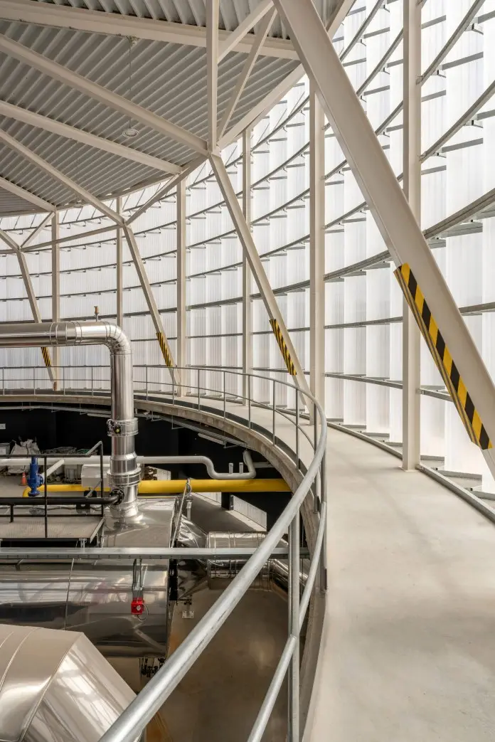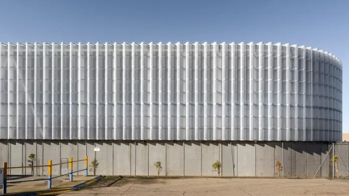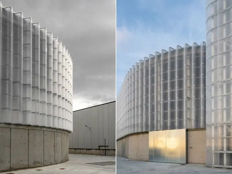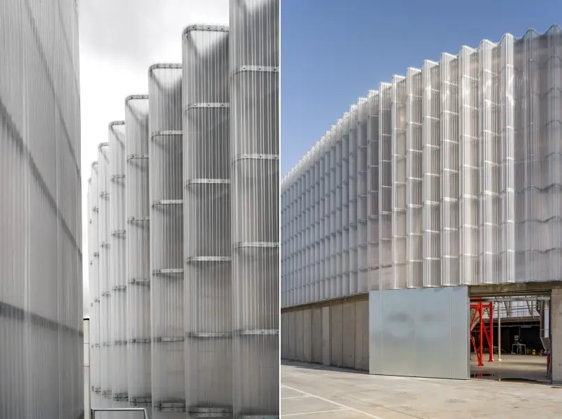 La fachada de policarbonato está compuesta por planchas estriadas y una subestructura flexible de acero galvanizado. Fue diseñado así para evitar deformaciones y garantizar la longevidad del edificio. Además, la ventilación natural se optimizó incorporando chapas microperforadas en la parte inferior de la fachada, y tapas de metacrilato en la coronación. Esta disposición permite una ventilación eficiente de la sala de calderas.